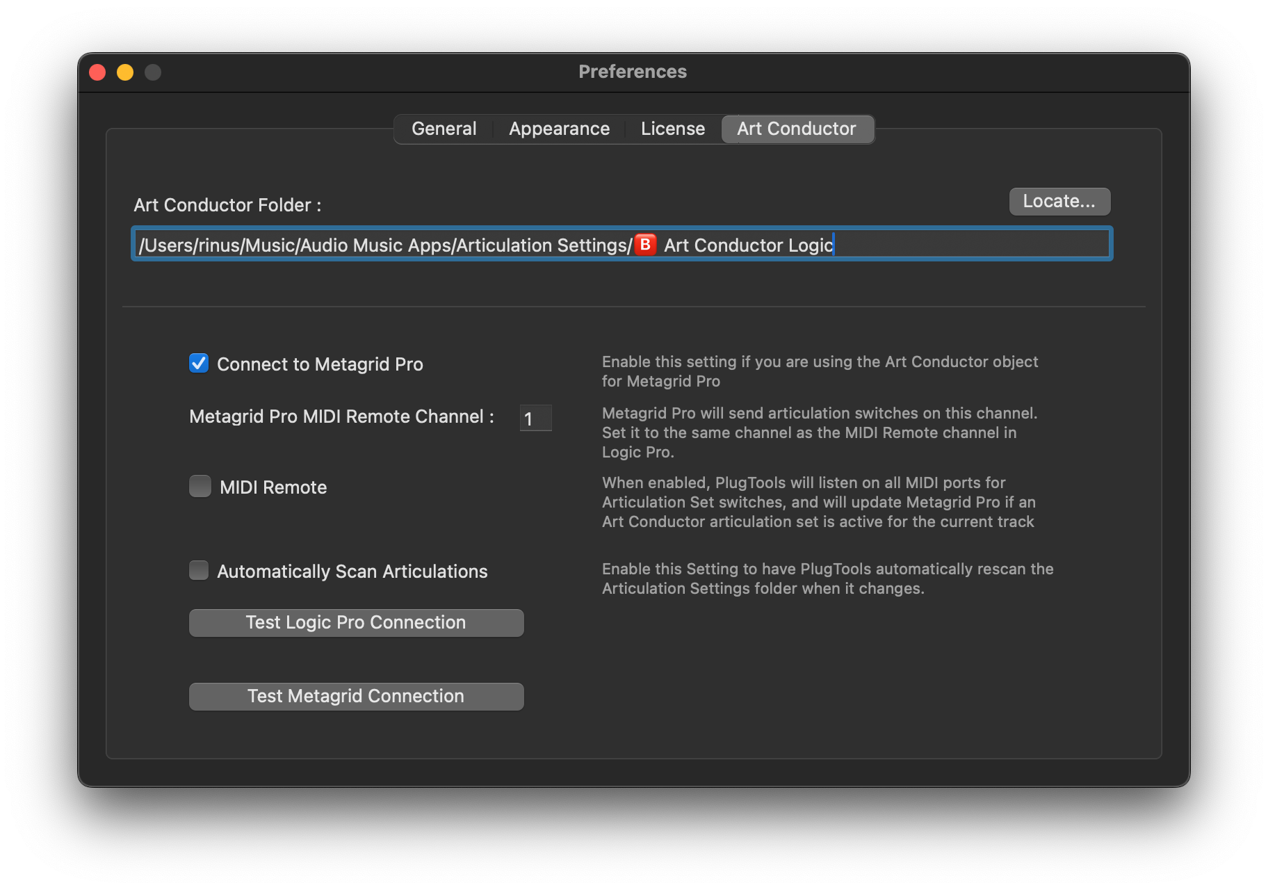 - Open the Art Conductor preferences in PlugTools and test the connection between PlugTools and Logic Pro