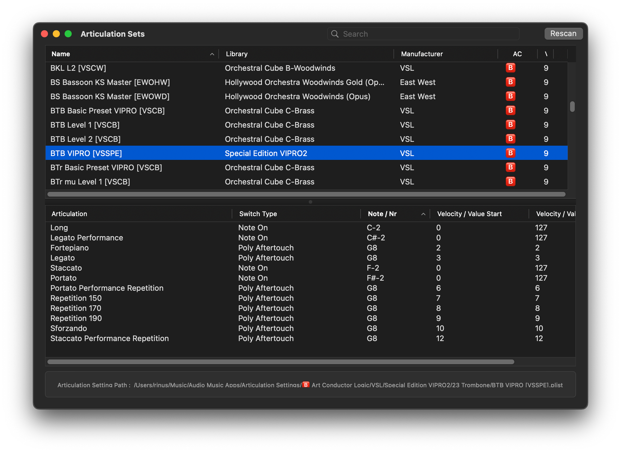 - Click the 'Rescan' button to force PlugTools to rescan the Articulation Settings folder