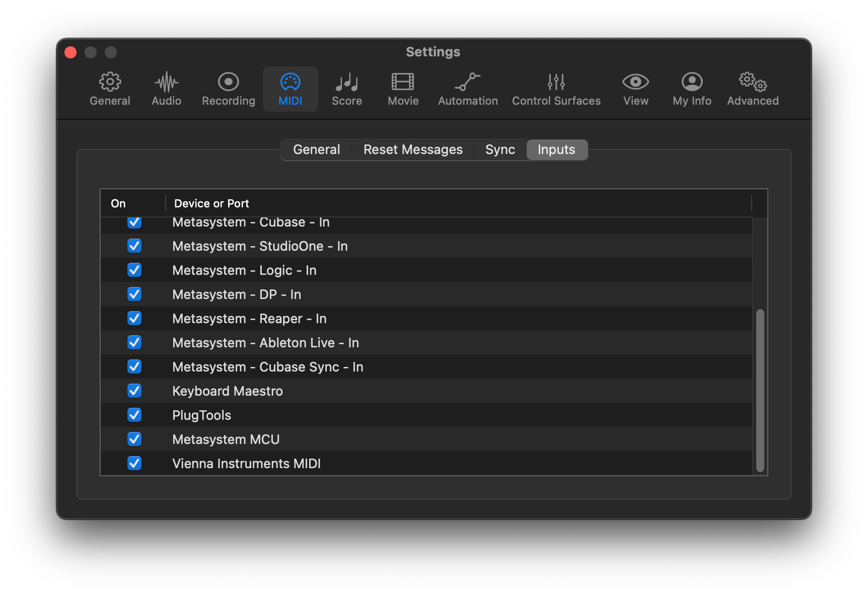 Next, go to Logic Pro > Settings > MIDI -> Inputs.